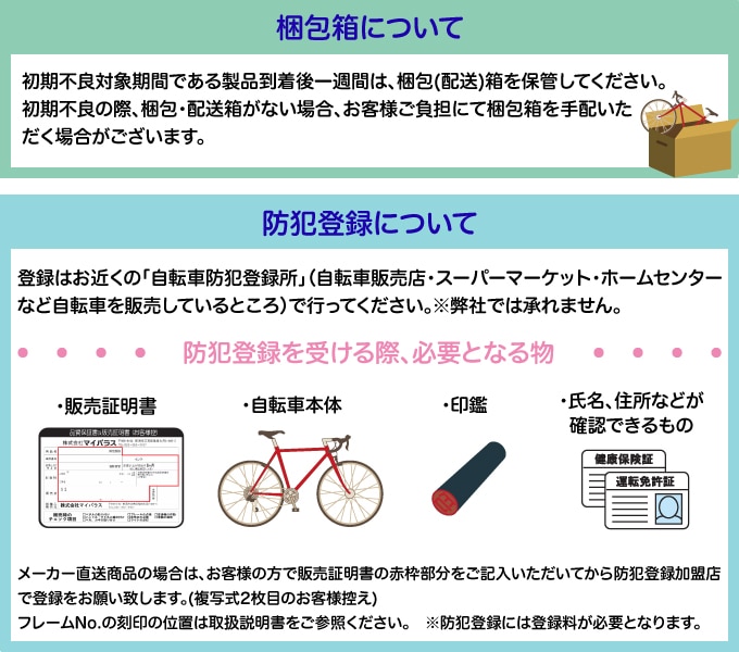 ※防犯登録は、お近くの「防犯登録加盟店」(自転車販売店、スーパー、ホームセンターなど自転車を売っているところ)、または所轄の警察署にご相談下さい。(料金は各都道府県によっても異なりますが500円〜1,000円が一般的です)