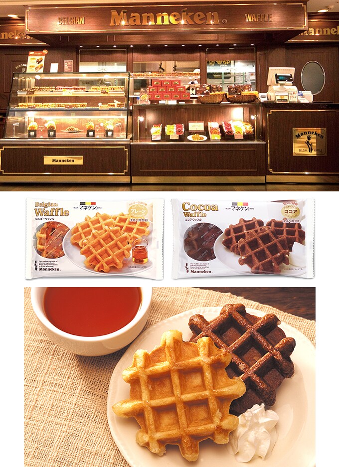 マネケン ベルギーワッフル 計60個 | プレーン・ココア 各30個/ベルギーの伝統的な味と形のワッフルです。ベルギー産「パールシュガー」が入った、ほどよい甘さとコクのある生地が特徴です。