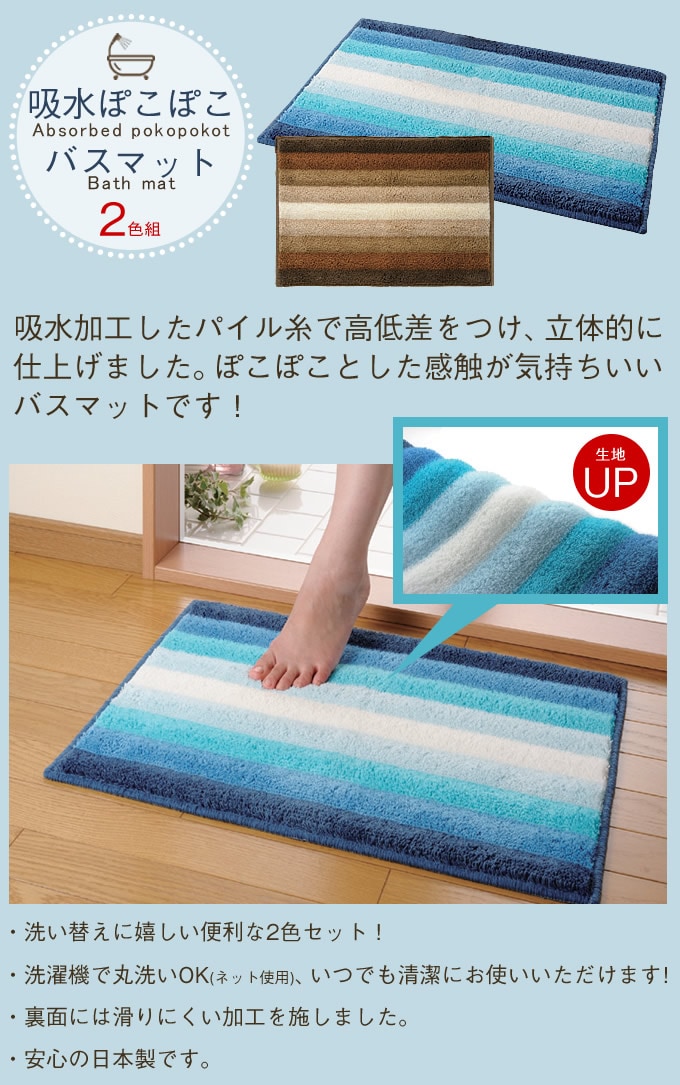 [ブラウン/ブルー]吸水バスマットぽこぽこ 2色組(65044) | 吸水バスマットぽこぽこ2色組 | しっかり吸水して凹凸が気持ちいい!
