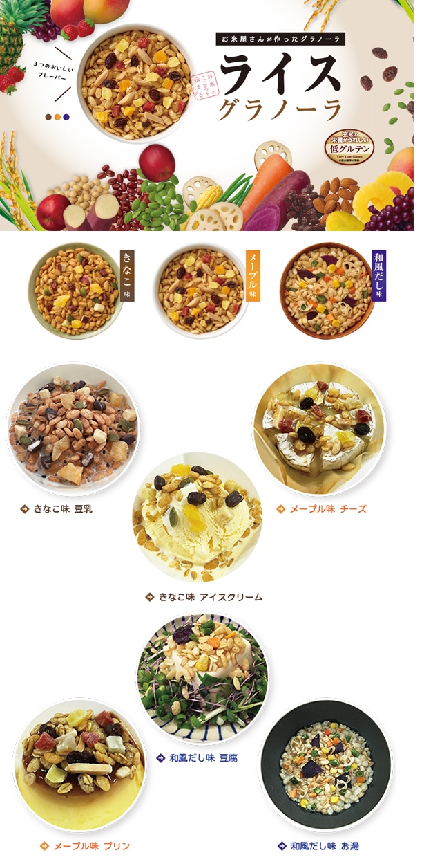 お米離れが叫ばれる今、「かたちは変わっても、ごはん(お米)を朝の食卓の主役にしたい」との想いから、 お米でつくった、おいしい「ライスグラノーラ」を開発しました。