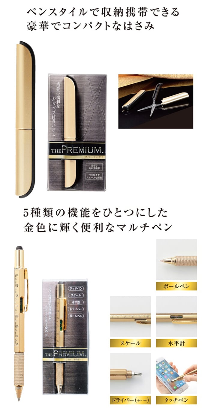 5 in 1多機能ボールペン&コンパクトはさみプレミアムセット | 金色に輝くプレミアムな文房具セット。5種類の機能を1つにした便利なペンと、ペンスタイルで収納携帯できるコンパクトなはさみ。
