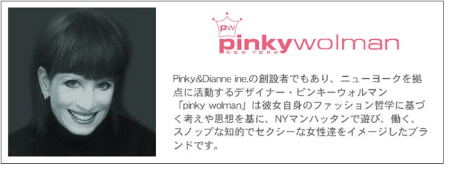 Pinky&Dianne inc.の創立者でもあり、ニューヨークを拠点に活動するデザイナー。「pinky wolman」は彼女自身のファッション哲学に基づく考えや思想を基に、N.Y.マンハッタンで遊び、働く、スノップな知的でセクシーな女性達をイメージしたブランドです。