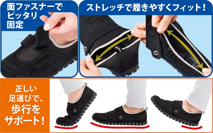 履き口はストレッチ素材のため着脱しやすく、面ファスナーで甲を固定できるのでよりフィットする