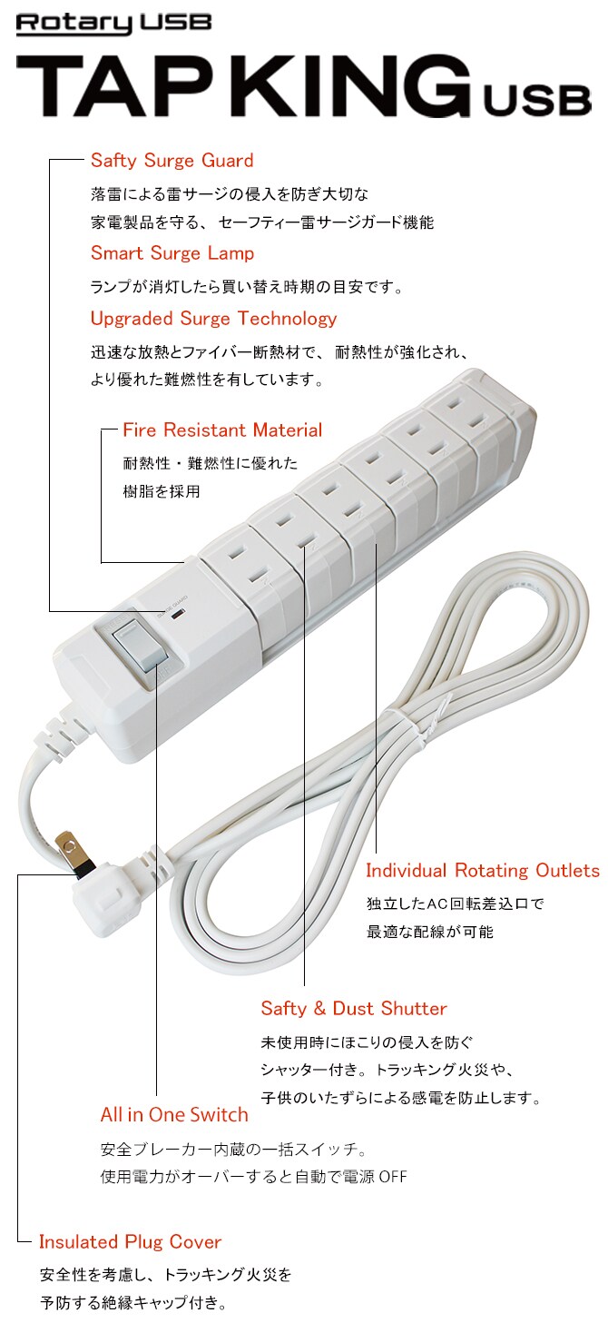 クルッと回転するAC差し込み口を6個備えた電源タップ。大きなACアダプタもしっかり収まる回転式電源タップ!