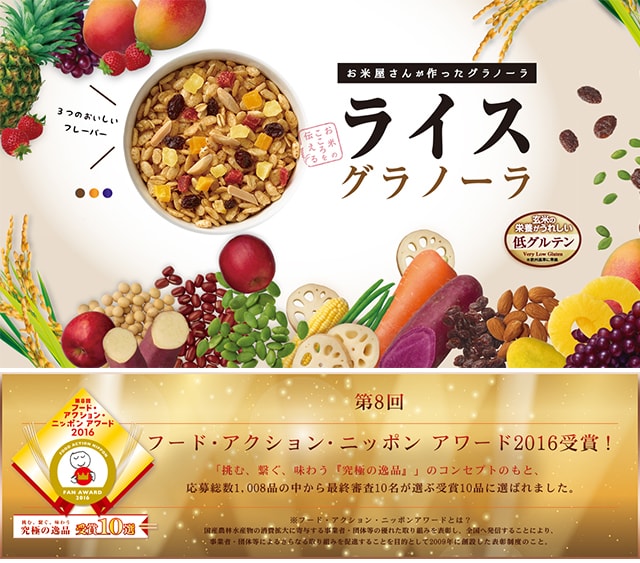 お米離れが叫ばれる今、「かたちは変わっても、ごはん(お米)を朝の食卓の主役にしたい」との想いから、 お米でつくった、おいしい「ライスグラノーラ」を開発しました。