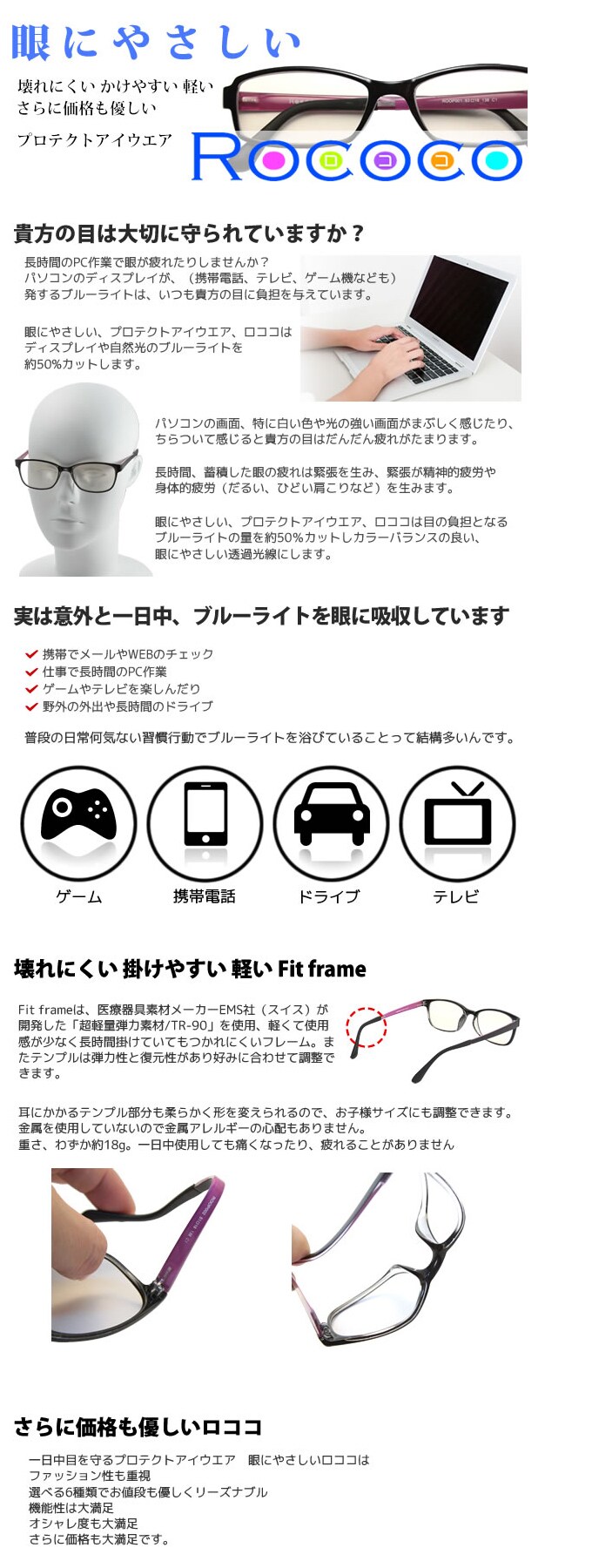 ブルーライトから目を守るプロテクトアイウエア。目に優しいロココはファッション性と、品質を重視。高評価を得ている韓国製CRレンズを使用し、フレームには壊れにくく軽いFitframe(素材は超軽量弾力素材 TR-90)を採用しております。