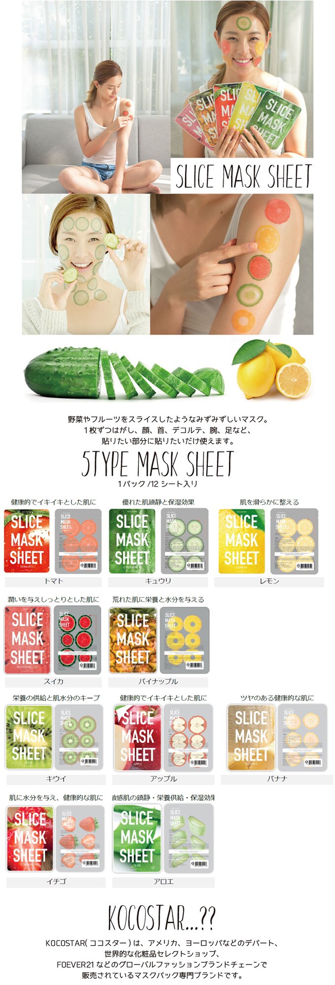 KOCOSTAR スライスマスクシート 12枚入×5袋 | 野菜やフルーツをスライスしたようなみずみずしいマスク。インスタなどのSNS映え間違いなし!※種類ランダム