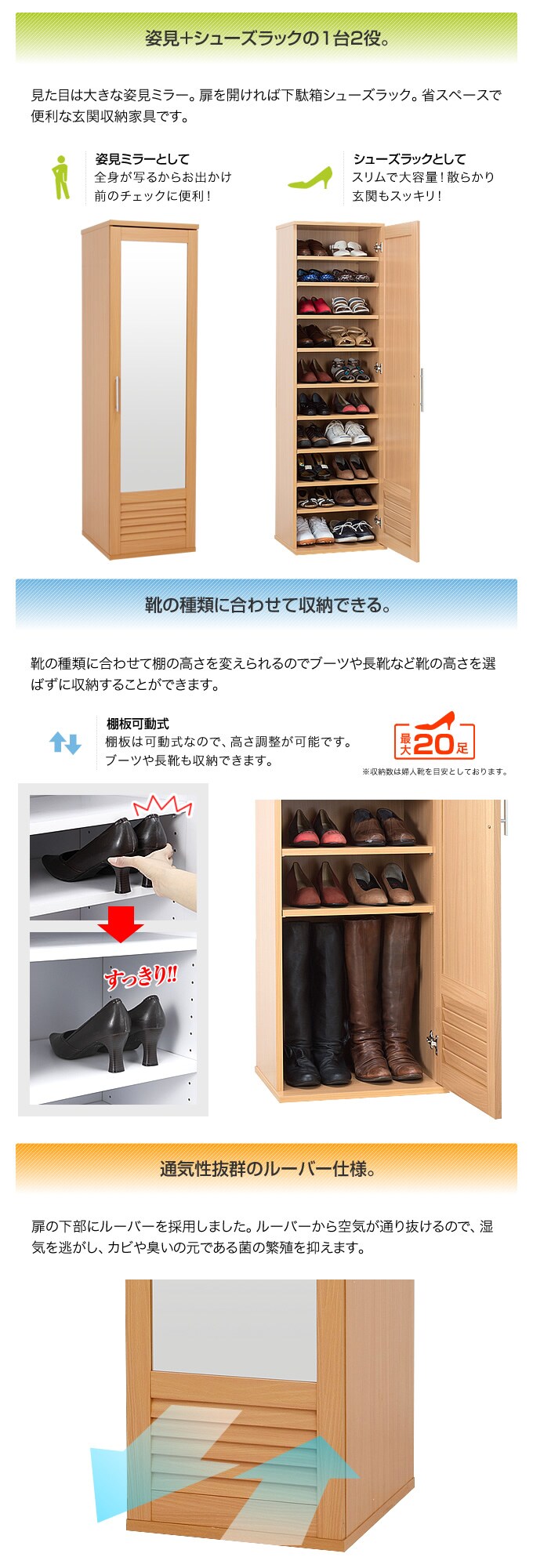 [ナチュラル]通気性の良いミラー付シューズボックス | 玄関で全身コーディネートチェックできるミラー付きシューズラック!