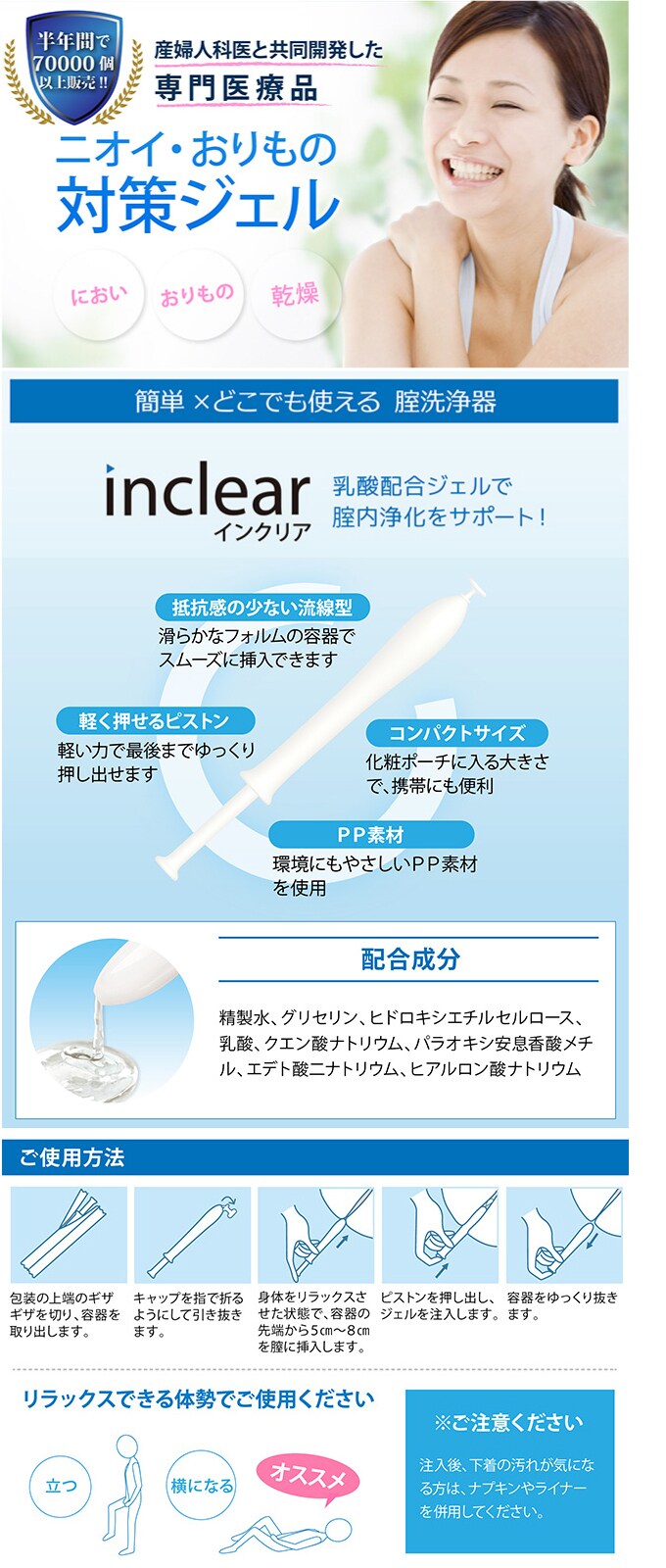 ※注入後、下着の汚れが気になる方は、ナプキンやライナーを併用して下さい。