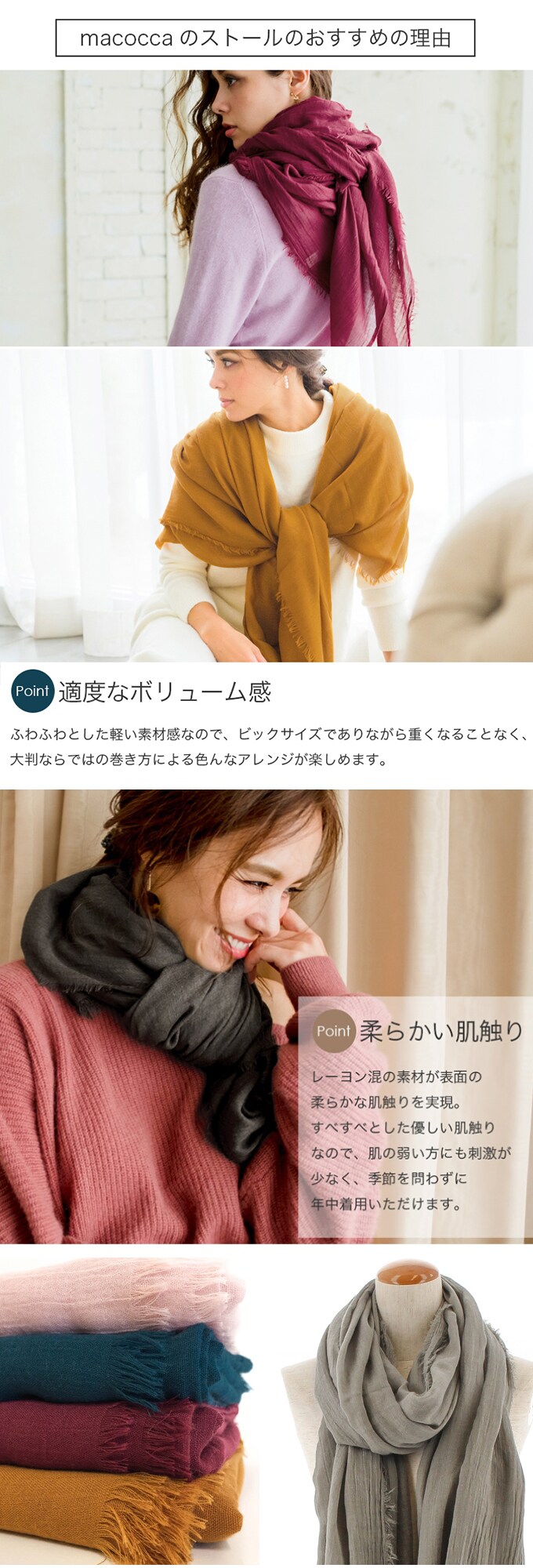 macoccaオリジナルの柔らかく、肌触りの良い生地を使用したビッグサイズの無地ストールです。
