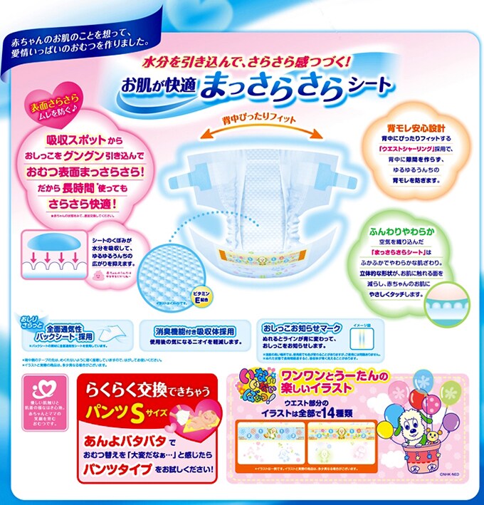 ◇日本初※となる通気性が高く、柔らかいエアスルー素材の「ふわさらメッシュシート」を、おむつの外側に新しく採用。おむつ内のムレを逃がしてお肌さらさら♪ ※H28年7月時点当社調べ