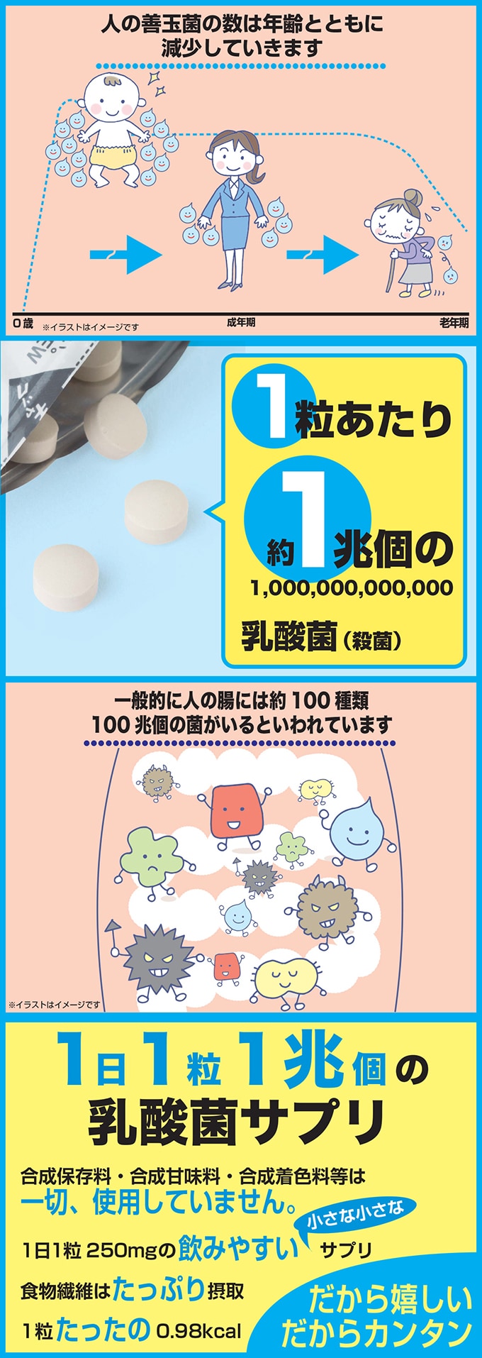 1日1粒摂取することで、乳酸菌を約1兆個摂取出来ます、1兆個の乳酸菌は100mlのヨーグルトに換算すると1000個分に相当します。数で言うと毎日ヨーグルト1000個分の乳酸菌が摂取出来ます。中に入っています乳酸菌はエンテロコッカスフェカリス菌で、人由来の特許製法で固まりになりにくくなっている乳酸菌です。
