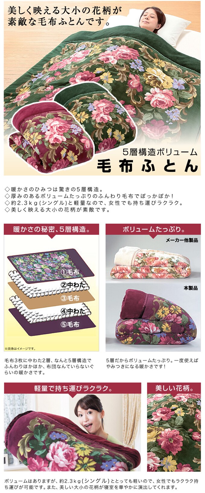 [ダブル/グリーン系]〈ナイススリープ〉5層構造ボリューム毛布ふとん | 毛布3枚に中わた2層、なんと5層でぽっかぽか!布団なんてなくていいくらいの暖かさ。