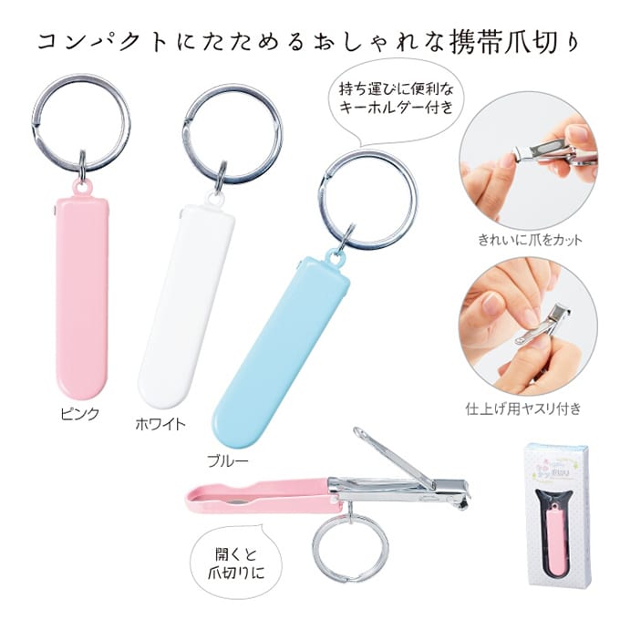 持ち運びに便利なキーホルダー付き。 開くと爪切りに!