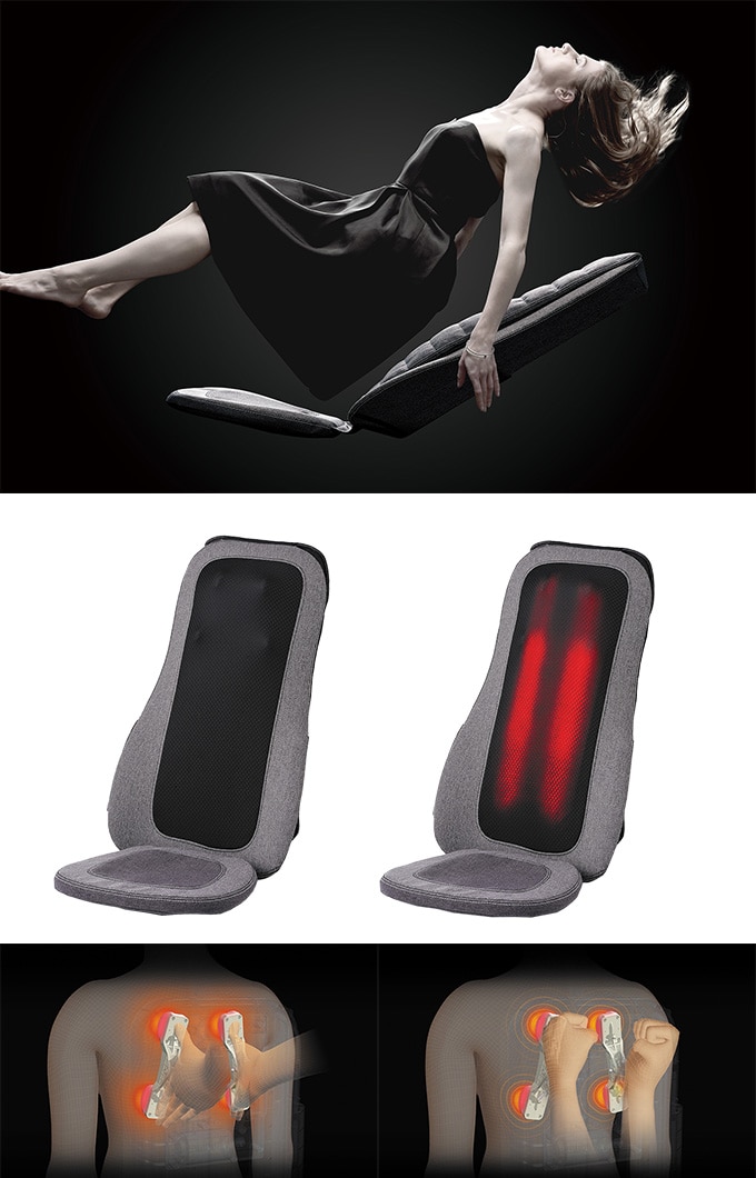 椅子やソファでくつろぎながら肩&腰をマッサージできます。背部には、持ち運びに便利なハンドグリップ付きです。すべてのもみ玉にヒーターを内蔵。人の手の温もりを再現しました。温めながらマッサージの効果をさらに高めます。