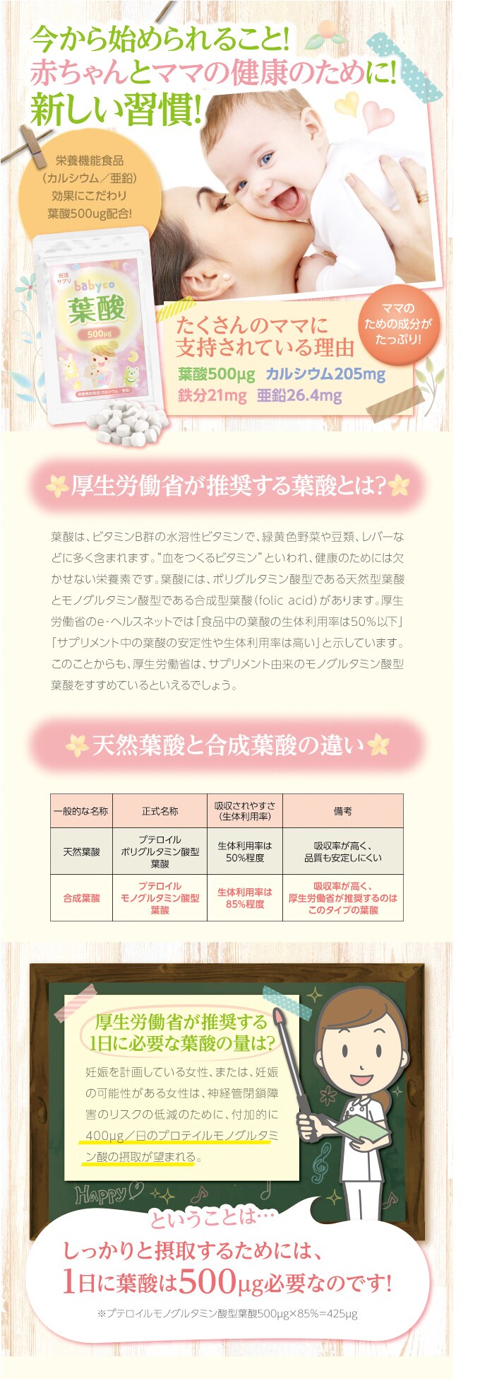 妊活サプリ “babyco葉酸” 120粒 | たくさんの先輩ママたちが支持する[妊活サプリ]効果にこだわり妊活に重要な栄養素≪葉酸500ug配合≫赤ちゃんとプレママの健康のために新しい習慣!