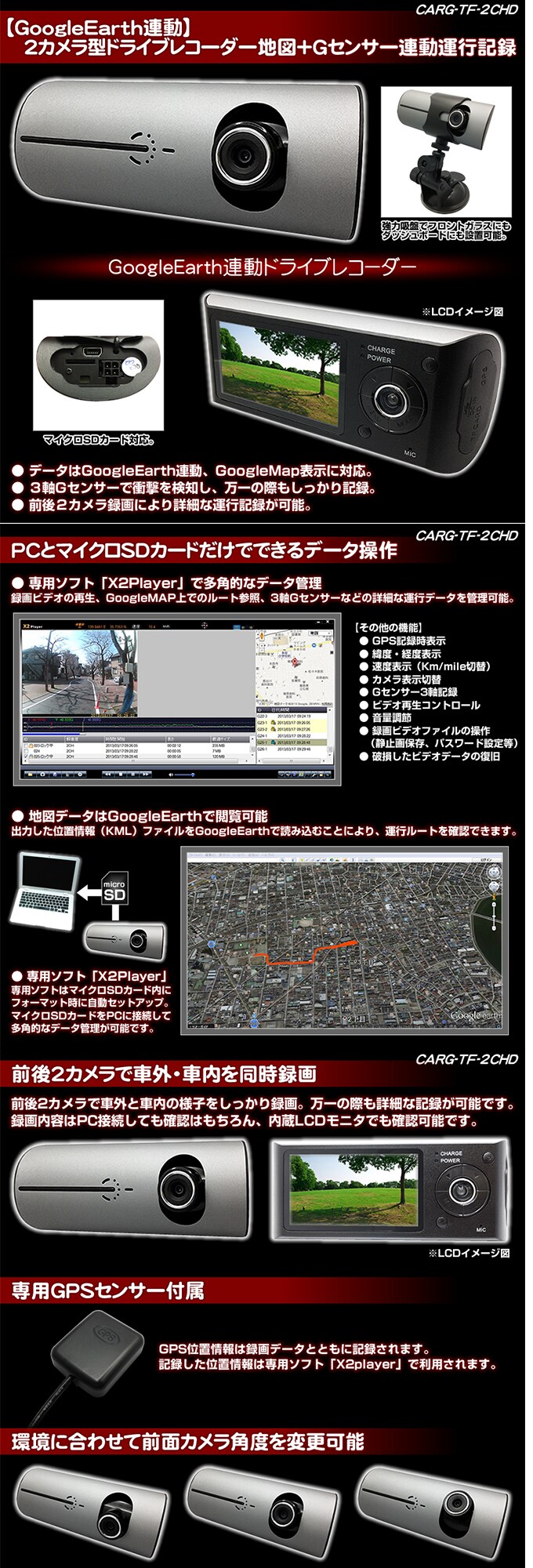 Google Earth連動 2カメラ型ドライブレコーダー | GPS運転記録GOOGLE連動・2カメラ搭載低照度対応センサー採用・3軸Gセンサー(衝撃感知センサー)・衝撃データロック機能
