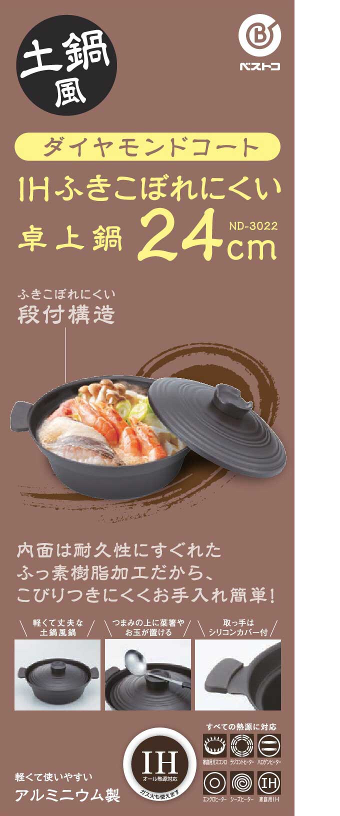 ベストコ/ダイヤモンドコート IH吹きこぼれにくい卓上鍋 24cm ND-3022 |より陶器に近い質感を追求した軽くて割れない吹きこぼれにくい卓上鍋シリーズです!
