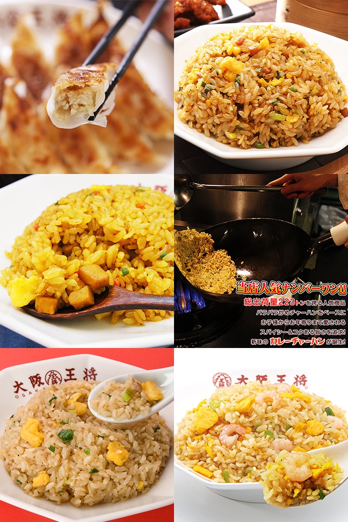大阪王将セット(肉餃子、炒めチャーハン、カレーチャーハン、ガーリックチャーハン、エビ塩炒飯、餃子のタレ) | 大阪王将の人気商品を堪能できる嬉しいセットです!!