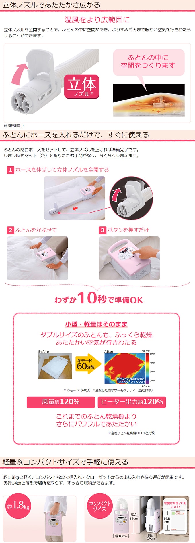 ◆これまでのふとん乾燥機(FK-C1)より風量・出力ともに120%パワーアップしたので、ダブルサイズのふとんにも対応できます。