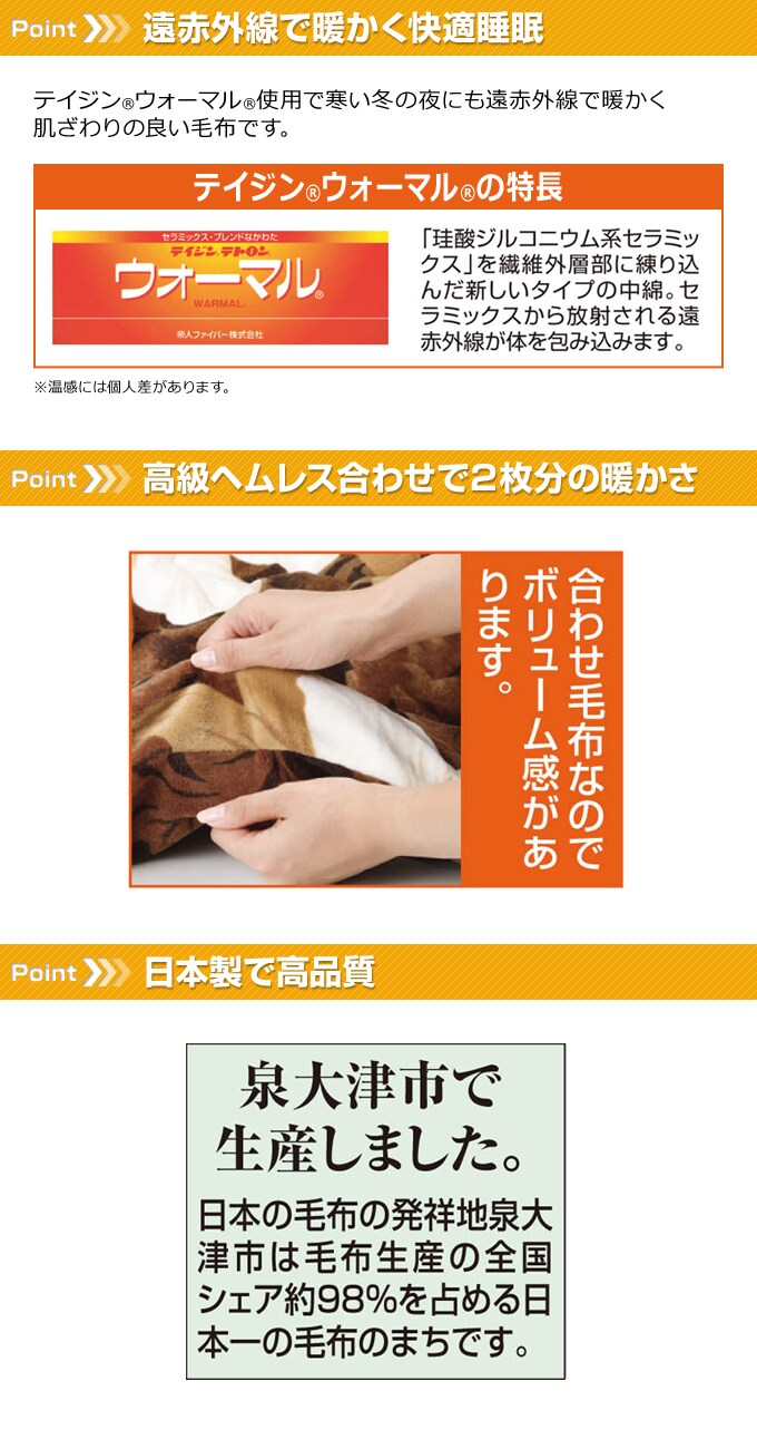 [グリーン]〈日本製〉テイジン(R)ウォーマル(R)使用 高級ヘムレス合わせ毛布布団 | 寒い冬の夜にも遠赤外線で暖かく肌触りの良い毛布で快適睡眠。