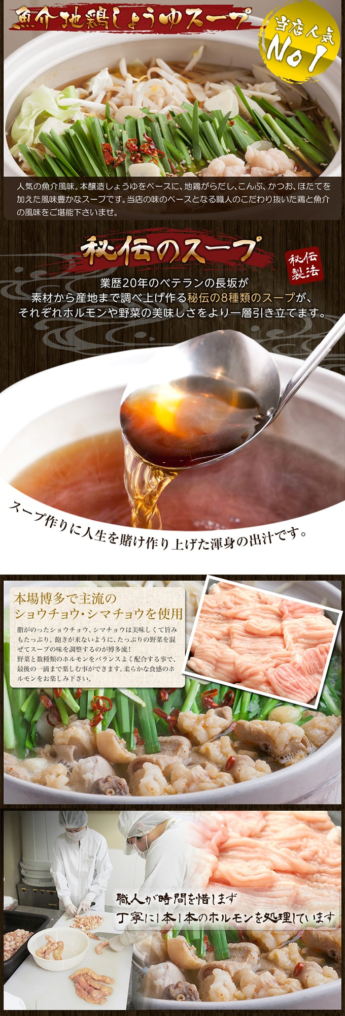 - ホルモン約1000g(250g×4袋)・ラーメン3玉・薬味×3・国産とろろ×3・もつ鍋地鶏醤油スープ(大)(約1500ml)