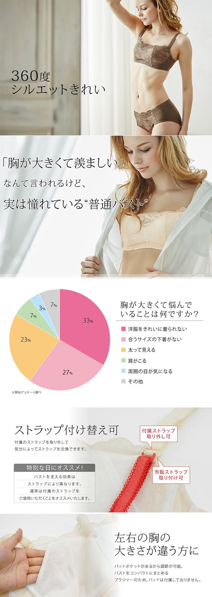 当商品は、大きな胸を小さく見せながらも、美しいシルエットにこだわった補整ブラジャーです。