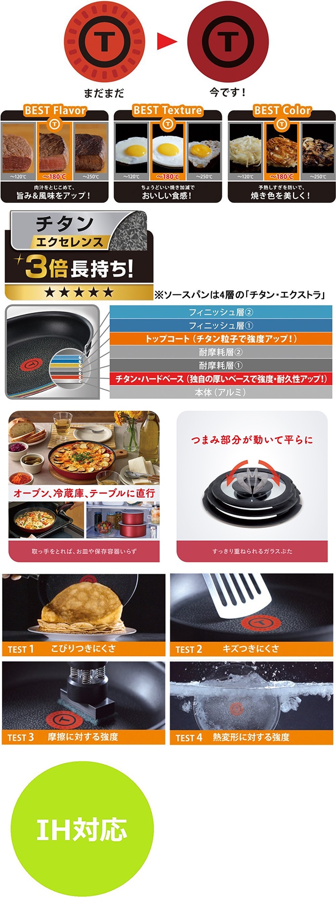 厚くなった「チタン・ハードベース」と、チタン粒子を配合したトップコートによりT-fal史上最高峰の耐久性を実現。 (ソースパンは4層の「チタン・エクストラ」コーティング)