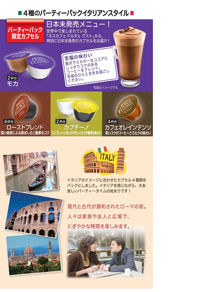 「ネスカフェ ドルチェ グスト ローストブレンド」4杯、「ネスカフェ ドルチェ グスト カプチーノ」2杯、「ネスカフェ ドルチェ グスト カフェオレ インテンソ」4杯、パーティーパック限定「ネスカフェ ドルチェ グスト モカ」2杯、計12杯分×販売個数