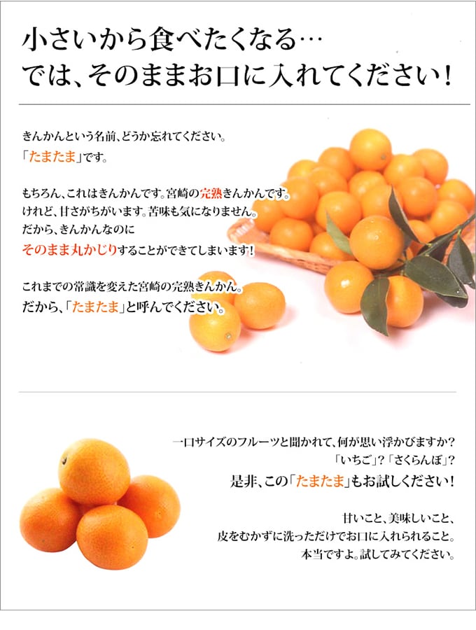 宮崎県産 完熟金柑 たまたま 1kg(玉数おまかせ)|宮崎ブランド 「たまたま」糖度16度以上!!丸ごと!皮ごと!そのまま食べれる!とっても甘~い果実です。