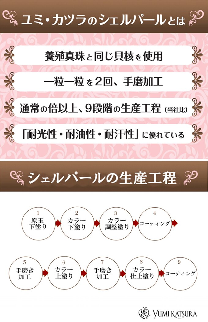 今回使用する「貝(シェル)パール」は、天然真珠と同じプロセスを再現し、真珠層の重ね塗りを職人の手により幾層にも丹念に施した高級シェルパール。