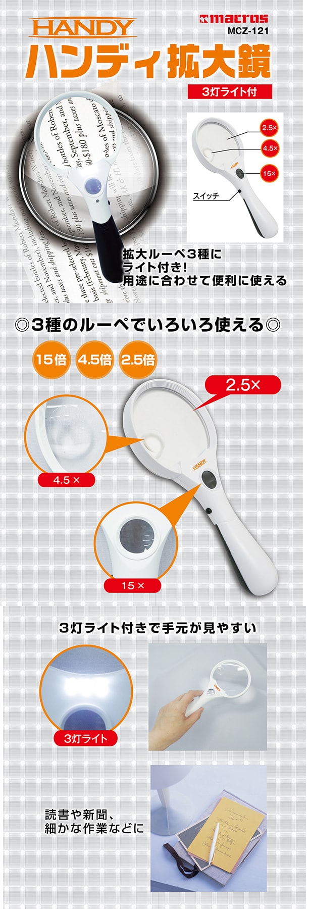 ハンディ拡大鏡 3灯ライト付|拡大ルーペ3種にライト付き!用途に合わせて便利に使える拡大鏡