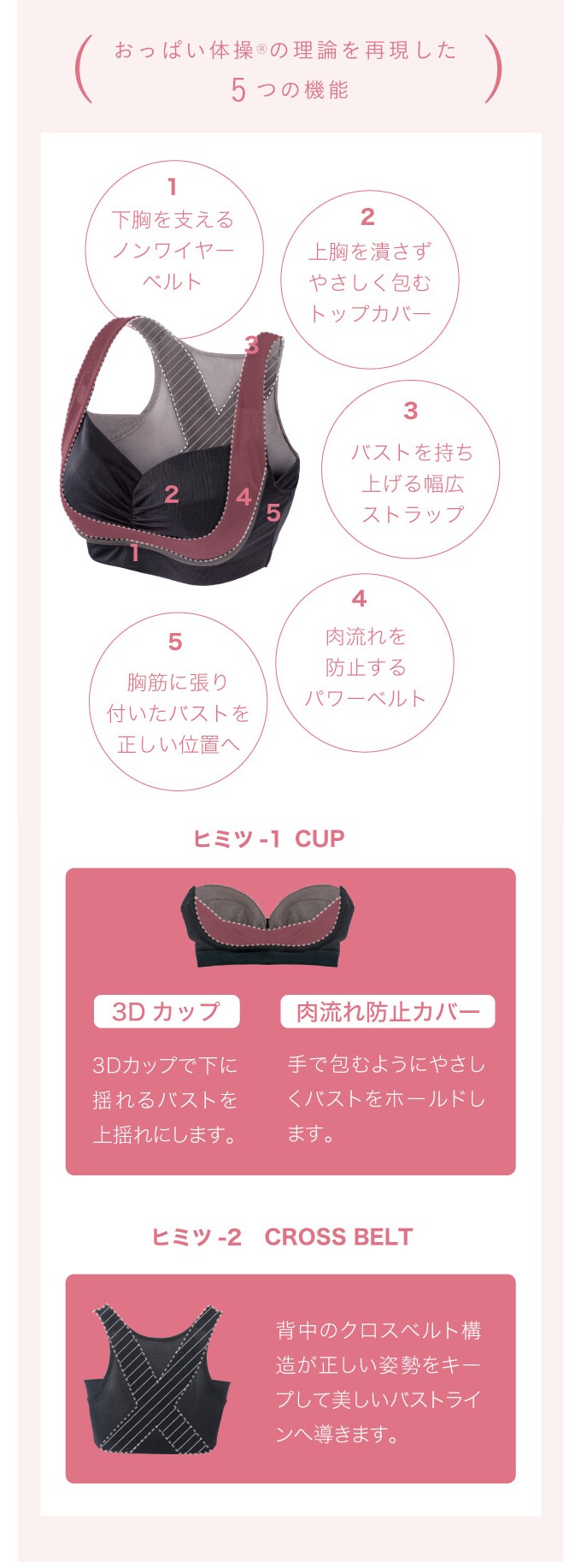 「おっぱい体操」の「おっぱいゆらし」が、着けるだけでできるブラです。おっぱいは、下に揺らすのではなく、斜め上に揺らすことが大切。このブラは3Dカップでバスト下をしっかりホールドして下揺れを防ぎ、バスト上はフリー設計で上揺れさせる構造になっています。動くたびにバストが上に揺れて「おっぱいゆらし」ができるので、理想的なふわふわ美乳をサポートします。わき肉をしっかり抑えてバストラインを美しく見せる効果も。ノンワイヤーで付け心地も良い仕様となっています。