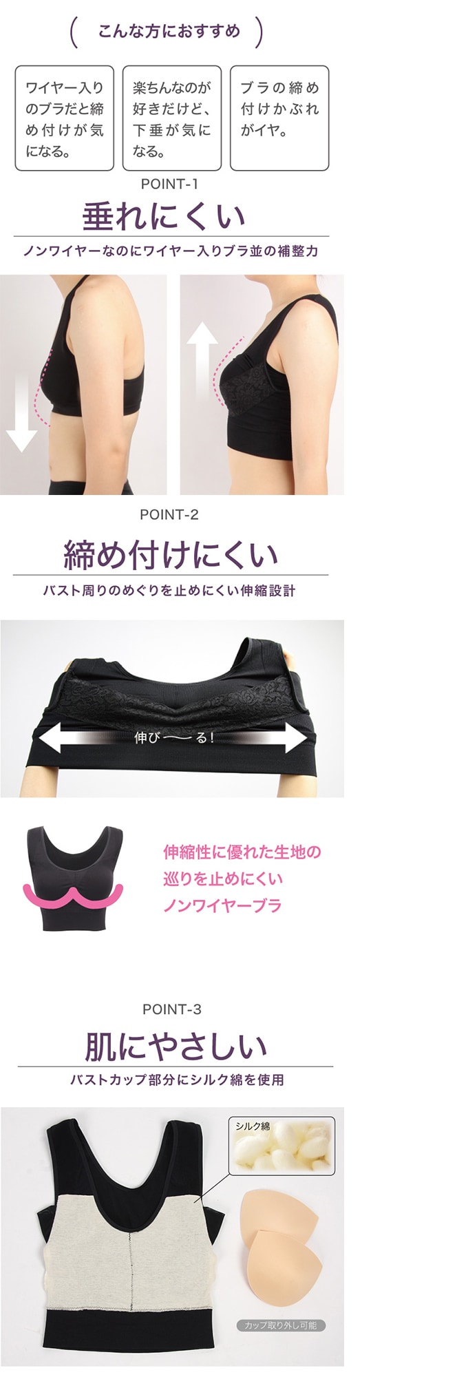 そこで本商品では、ハンモック構造のレースのパワーネットによりバストをやさしく持ち上げ、衰えた小胸筋をサポートします。