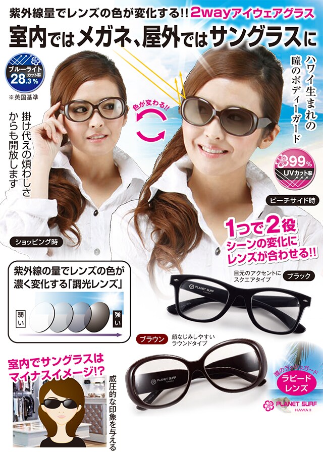 室内では透明グラスのオシャレなメガネなのに外で紫外線にあたると変色しサングラスに早変わり。ハワイのサーフブランド「プラネットサーフ」からデザイン性も高く、オシャレをしながら目から入る紫外線を手軽にケアできる夏のマストアイテムが登場です。室内にはいり、わざわざ外す手間もなくなります。