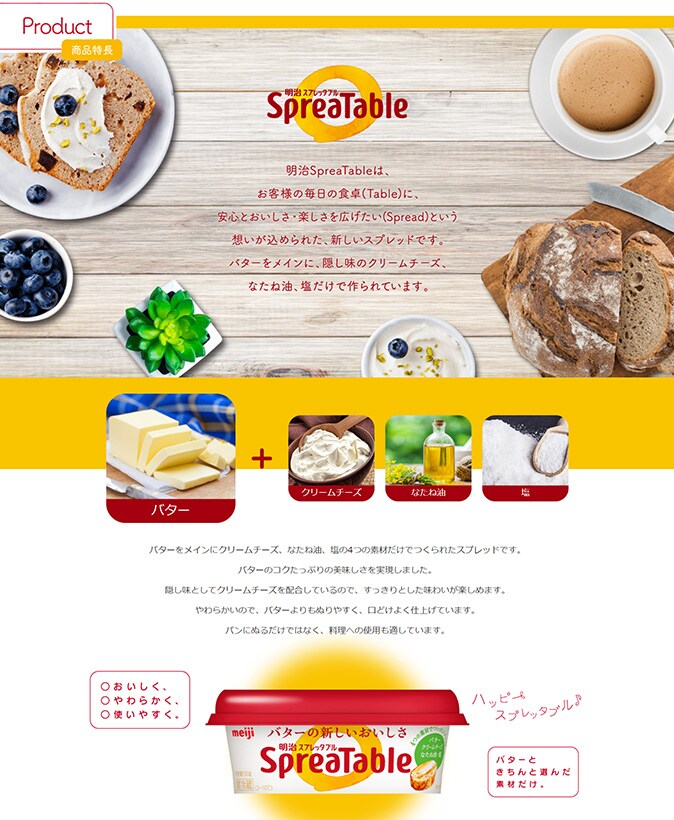 バターをメインにクリームチーズ、なたね油、塩の4つの素材だけでつくられたスプレッドです。「バターのコクのあるおいしさ」と「やわらかさ、使いやすさ」が特徴です。パンにぬるだけではなく、様々な料理への使用にも適しています。