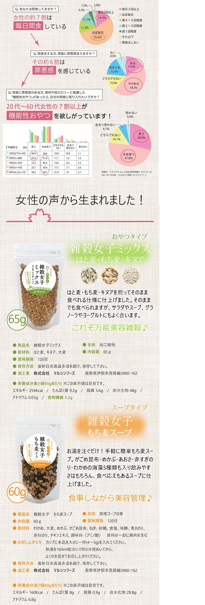 - 雑穀女子ミックス65g、雑穀女子もち麦スープ60g