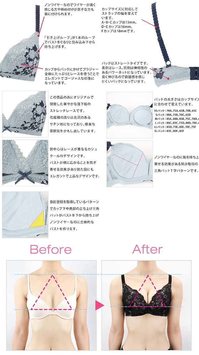 オリジナルで開発した華やかな落下版のストレッチレースを使った見た目にも機能性にもこだわったノンワイヤーブラです。