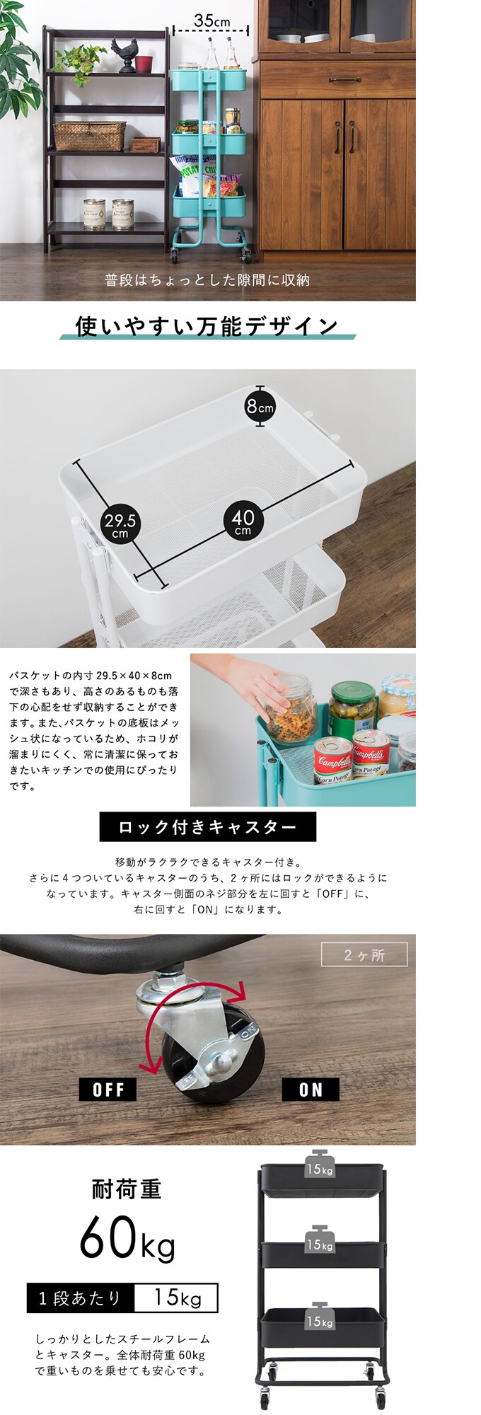 [ターコイズブルー]キャスター付きキッチンワゴン 3段|どんなシーンにも合わせやすい万能デザイン。