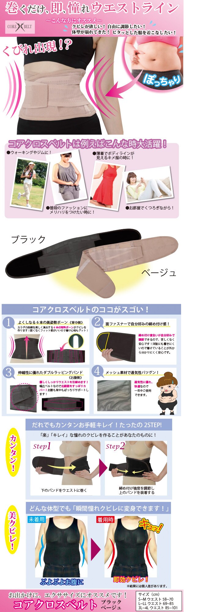 [L-LL/ブラック]コアクロスベルト | 巻くだけで、即、憧れウエストライン!お出かけにエクササイズにオススメです!!