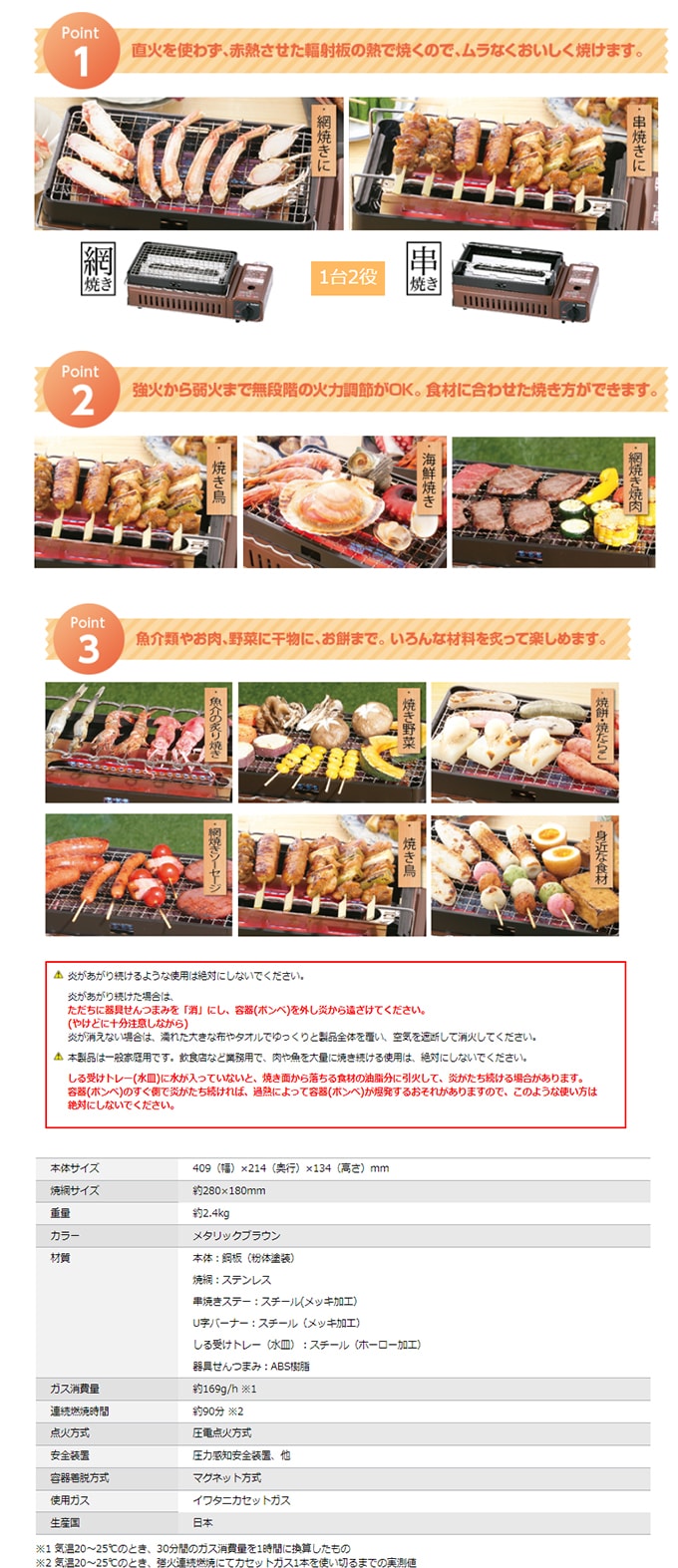 ※本製品は一般家庭用です。飲食店など業務用で、肉や魚を大量に焼き続ける使用は、絶対にしないでください。