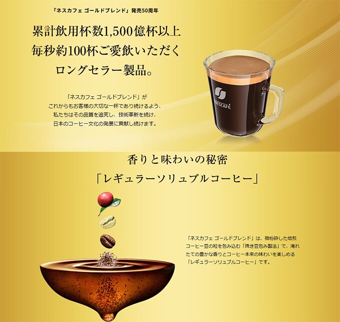 微粉砕した焙煎コーヒー豆の粒を包み込むことで、淹れたての上品な香りとコーヒー本来の味わい、雑味のない澄みきった後味を実現した「レギュラーソリュブルコーヒー」です。飲み終わった後、カップの底に見えるその粒こそが、確かな品質の証です。コーヒー豆本来の味わいをさらに追及し磨きぬかれたマイルドかつ奥行きのある味わいと、あふれる香りをお楽しみください。