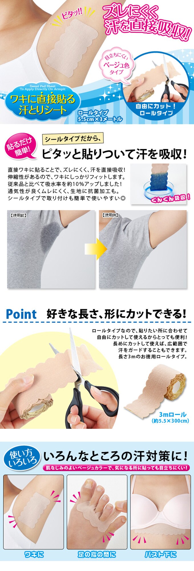 [2個セット]ワキに直接貼る汗とりシートロール | 好きな長さ、形にカットできる汗取りシート!
