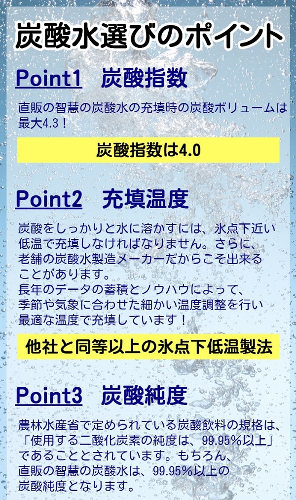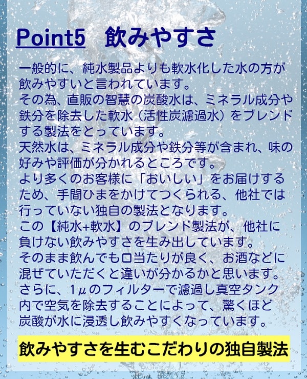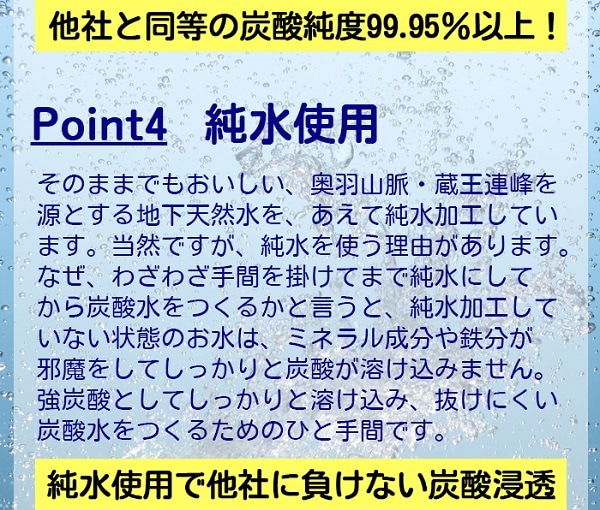 炭酸を深く浸透させため、純水加工を施し炭酸を充填しています。また、飲みやすくするためにミネラルや鉄分を除去した軟水(活性炭濾過水)を加えています。