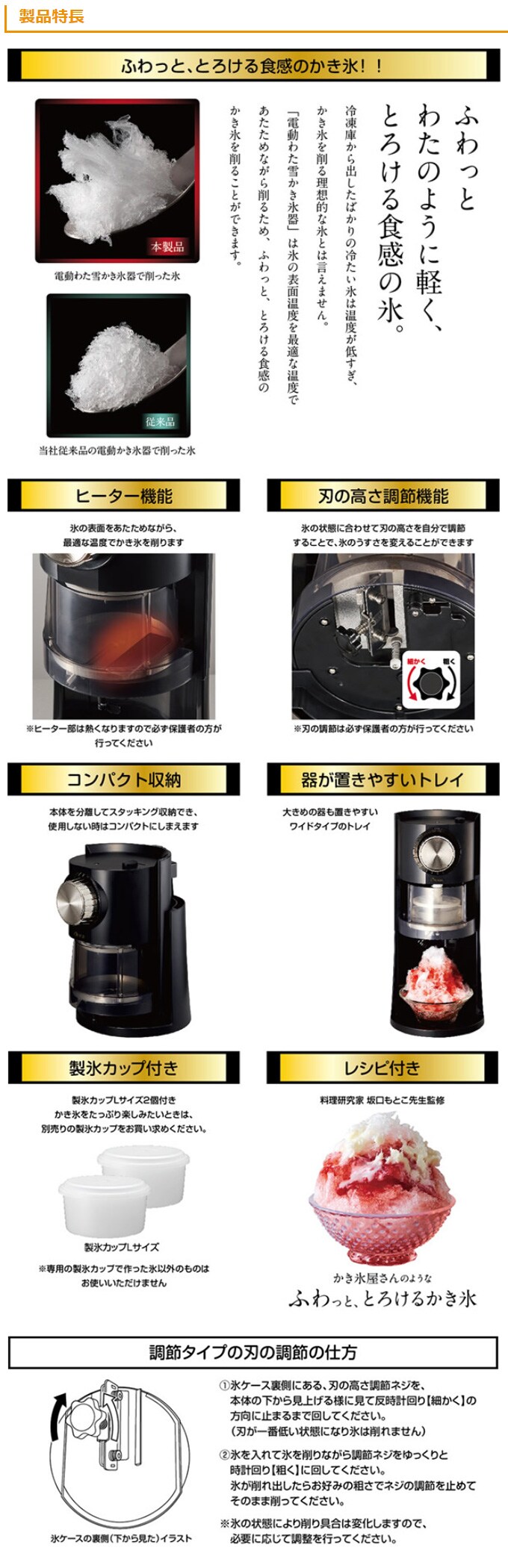 「電動わた雪かき氷器」は氷の表面温度を最適な温度であたためながら削るため、ふわっと、とろける食感のかき氷を削ることができます。