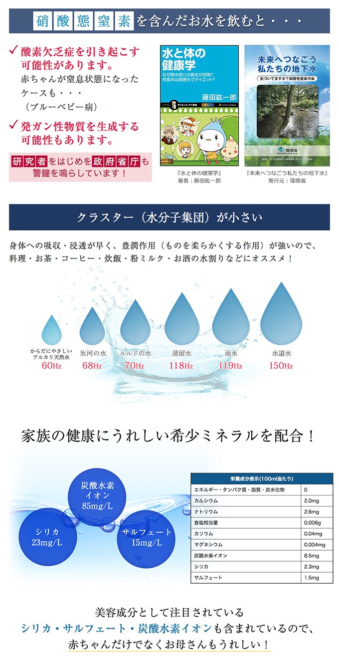 世界的にも希少な「硝酸態窒素」を全く含まない天然水で、硬度50ml/Lの軟水でミネラルバランスも良く、喉越しはまさに日本人好みになっています。