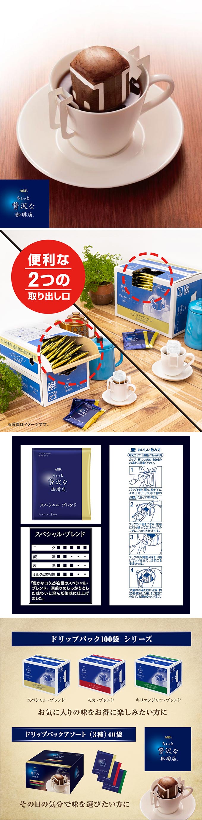[100袋]ちょっと贅沢な珈琲店 レギュラー・コーヒー ドリップパック スペシャル・ブレンド | ブラジル最上級グレード豆を贅沢に使用。深く濃い香りがひきたつ上質なコク、澄んだ後味をお楽しみください。