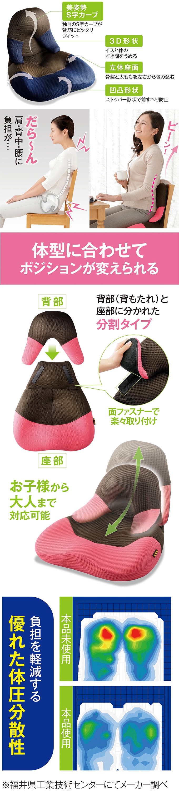 独自の形状が椅子とカラダのすき間を埋めてピッタリフィット、長時間座っても疲れにくい