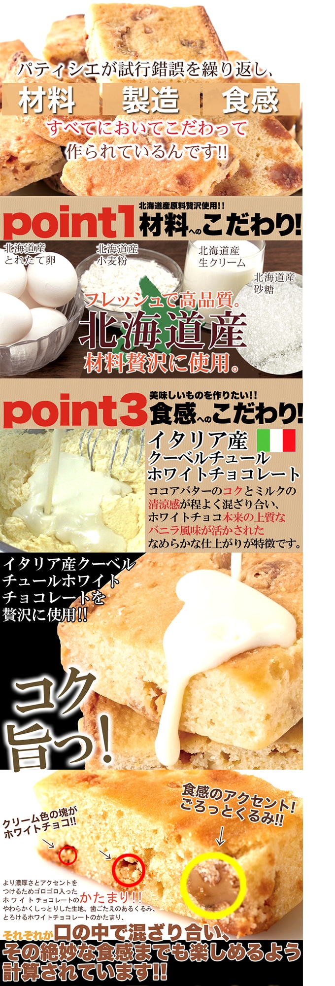 ホワイトチョコと北海道産原料の「バランス」また食べたくなる「コク」くるみと生地の「食感」やみつきになる美味しさです!!