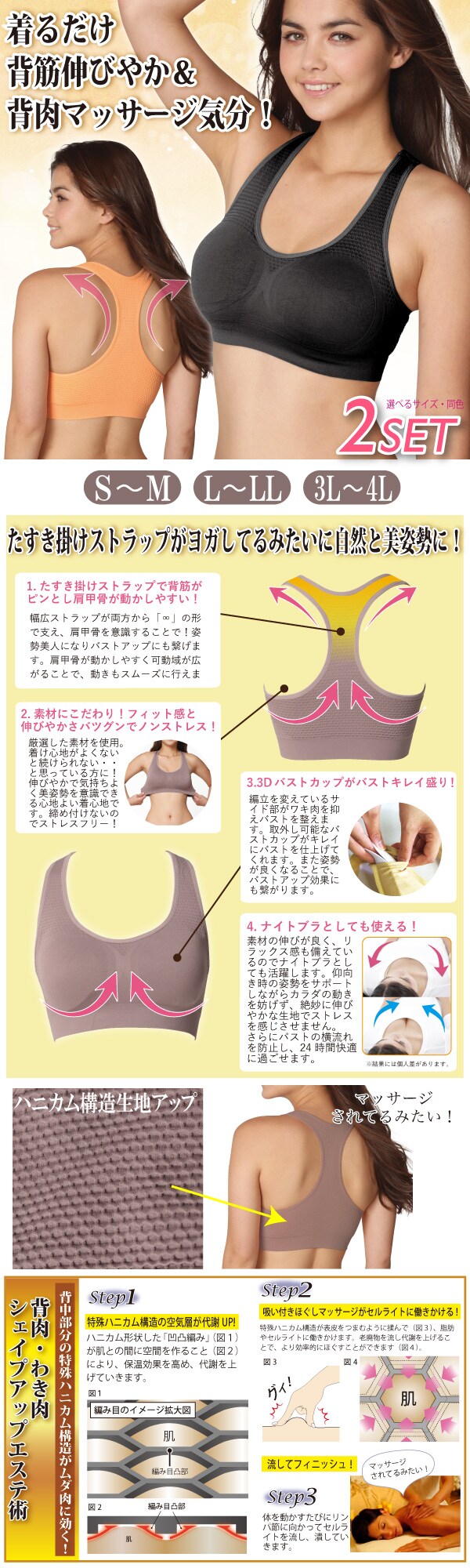 [S-M/ヌードベージュ2枚]エアーフィットマッサージヨガブラ2枚組 | 着るだけで背筋伸びやか&背肉マッサージ気分!エステ体感の新感覚楽ちんブラ♪